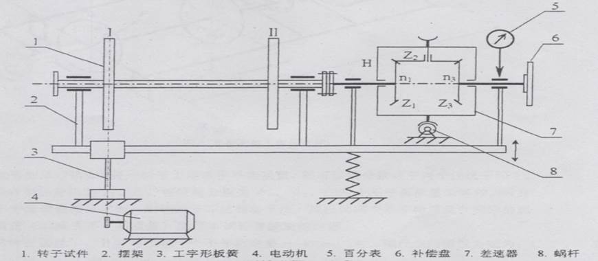 試件的不平衡質量的大小和相位可通過安裝在擺架的右端的測量系統獲得,這個測量系統由補償盤6和差速器7組成。差速器的左端為轉動輸入端(n1)通過柔性連軸器與試件連接;右端為輸出端(n3)與補償盤相連接。