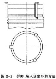 用塞尺測量各部 位的間隙 用燈光漏光的情 況測定環與氣 缸的接觸情 況,用塞尺測 量環與缸壁的 間隙 |