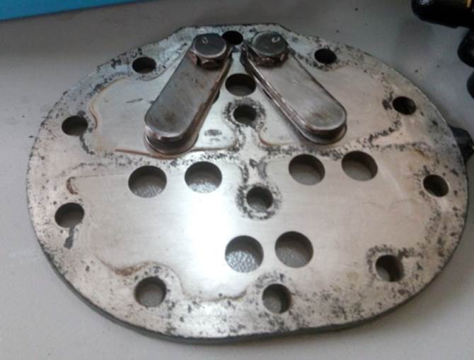 9.裝入底板,將壓縮機翻轉,放上墊片,裝上閥板組,吸汽閥片應對準活塞頂面上的凹槽,不得裝反。