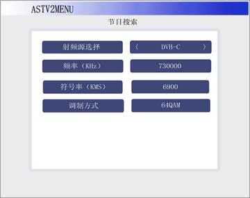 4. 數字電視射頻接收信號(MPEG-2 TS流)播放:首先選擇TV欄,按OK鍵進入下一級菜單,如圖1-5,按鍵盤控制器上的←或→鍵可在射頻源選擇欄上選擇DVB-C(數字射頻)或者ATV(模擬射頻).首先我們選擇DVB-C.然后我們把頻率、符號率、調制方式的參數設置成與QAM調制器一致.確認正確后按下OK鍵.此時系統進入節目掃描菜單,如圖1-6當掃描進度條掃描到“100”時,再按OK鍵,則可以進入播放界面,選擇播放的節目,按OK播放.此時觀看LCD屏上所播放的影象。