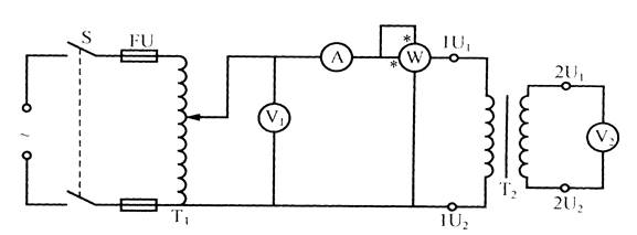 調(diào)壓變壓器一臺(tái),待測變壓器一臺(tái),交流電壓表兩只,交流電流表一只,低功率因數(shù)功率表一只,刀開關(guān)一只,導(dǎo)線若干。