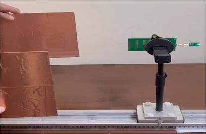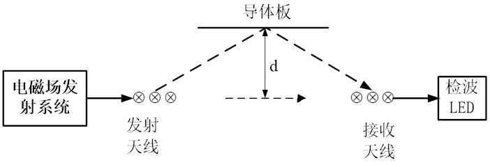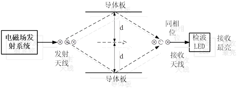 當用直射線和兩條反射線疊加相位相等時LED最亮,相位相反時,接收電磁波抵消LED不亮。移動距離中軸線的距離d,接收LED時滅時亮,某一個位置時達到最亮。記錄下距離中軸線的距離d,計算直射線和反射線的距離差值。反射線經過導體板反射時有180度的相位差。