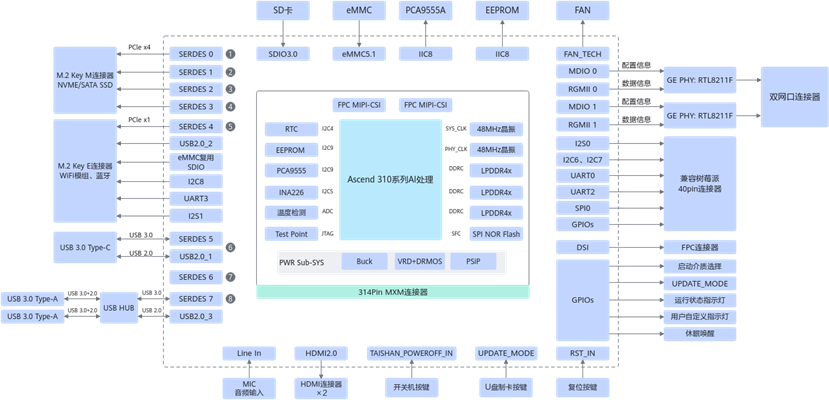 CPU :為 Ascend 310 AI 處理器,1個DaVinciV300 AI core(主頻500MHz),4個TAISHANV200M處理器核(主頻1.0GHz); 內存:8GB LPDDR4X內存,64bit位寬; 算力:半精度(FP16):4TFLOPS,整數精度(INT8):8TOPS; 存儲:配備8GB LPDDR4X內存,可外接最高256GB Micro SD; 核心擴展: 40Pin擴展接口:1個; USB Type A接口:2個; HDMI接口:2個; USB Type C接口:1個; Micro SD卡接口:1個; MIPI-CSI連接器:2個,8Lane; 風扇接口:1個; 千兆網口:1個; |