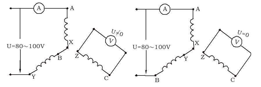 先用萬用表測出各相繞組的兩個線端,將其中的任意兩相繞組串聯,如圖3-2所示。將控制屏左側調壓器旋鈕調至零位,按下“啟動”按鈕,接通交流電源。調節調壓旋鈕,并在繞組端施以單相低電壓U=80~100V,注意電流不應超過額定值,測出第三相繞組的電壓, 如測得的電壓值有一定讀數,表示另兩相繞組是末端與首端相聯,如圖3-2(a)所示。反之,如測得電壓近似為零,則另兩相繞組是末端與末端(或首端與首端)相聯,如圖3-2(b)所示。用同樣方法測出第三相繞組的首末端。
