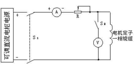 按圖3-1接線。把R調至最大位置,合上開關S1,調節直流電源輸出電壓及R阻值使試驗電流不超過電機額定電流的20%,以防因試驗電流過大而引起繞組的溫度上升,讀取電流值,再接通開關S2讀取電壓值。讀完后,先斷開開關S2,再斷開開關S1。