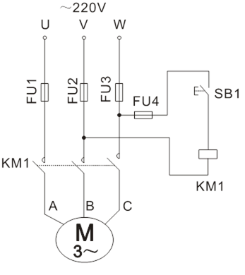 按圖5-6接線。圖中SB1、KM1、FU1、FU2、FU3、FU4為掛件GDQ39-1上的器件,電機選用DQ10(△/220V)。接線時,先接主電路,它是從220V三相交流電源的輸出端U、V、W開始,經熔斷器FU1、FU2、FU3、接觸器KM1主觸點到電動機M的三個線端A、B、C的電路,用導線按順序串聯起來,有三路。主電路經檢查無誤后,再接控制線路,從熔斷器FU4插孔W開始,經按鈕SB1常開、接觸器KM1線圈到插孔V。線路接好經指導老師檢查無誤后,按下面步驟進行實訓: