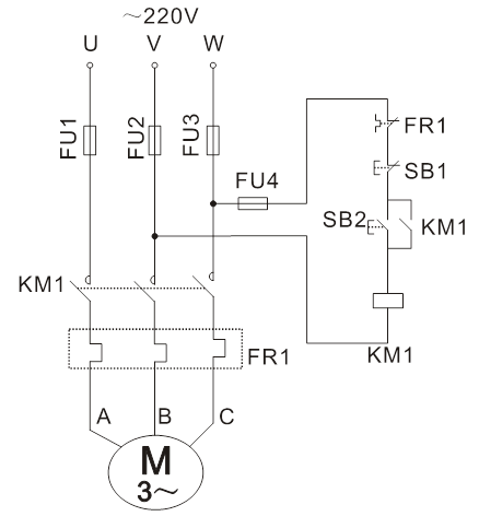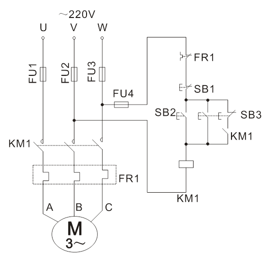 按下控制屏上“停止”按鈕切斷三相交流電源后,按圖5-8接線,圖中SB1、SB2、SB3、KM1、FR1、FU1、FU2、FU3、FU4為掛件GDQ39-1上的器件,電機選用DQ10(△/220V)。