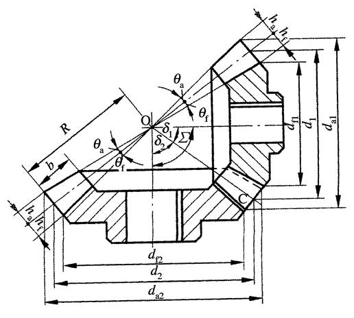 圓柱齒輪中的各有關圓柱參數,對于錐齒輪都變為圓錐參數了。錐齒輪的兩個端面的尺寸不同,因此將其分為大端參數和小端參數,為了計算和測量方便,通常取錐齒輪大端的參數為標準值,即大端分度圓壓力角a=20°,大端模數為標準模數。直齒錐齒輪在設計、制造和安裝方面都比較簡單,應用廣泛。