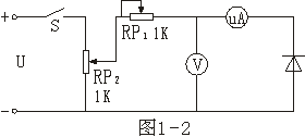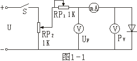 1、測正向特性。按圖1-1連接電路,PV用萬用表2.5V檔,二極管用2AP,電流表用200mA。