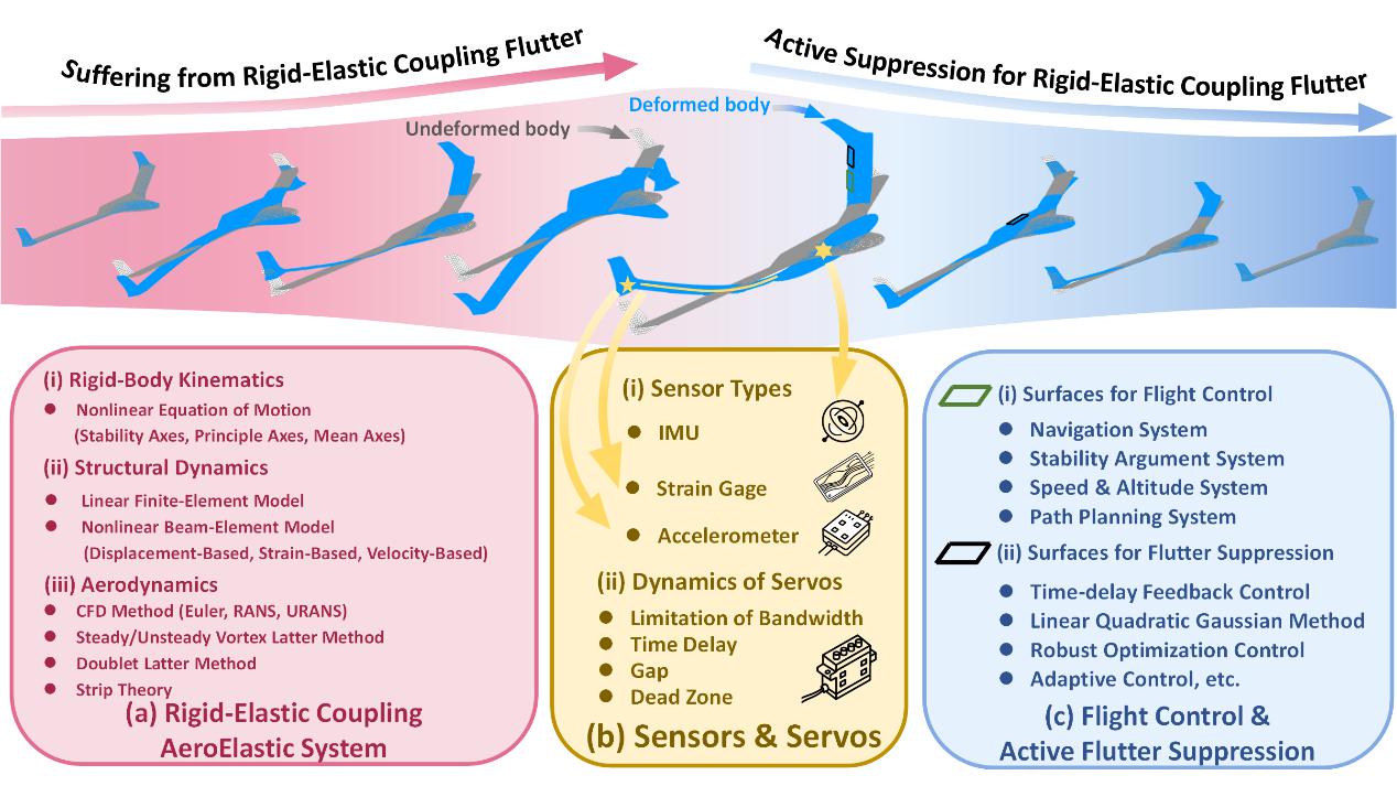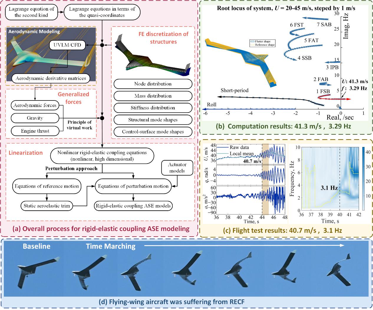 團隊提出僅含四個自由度的剛-彈耦合動力學模型,探明了剛-彈耦合顫振中飛行力學的短周期模態、沉浮模態與結構彎曲模態、扭轉模態間的耦合效應,揭示了敏感參數對剛-彈耦合顫振特性的影響規律。