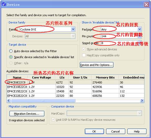 4)點擊NEXT,進入下一個設定對話框,按默認選項直接點擊NEXT進行器件選擇對話框。如圖1-4所示。這里我們以選用CycloneIV系列芯片EP4CE6E22C8N為例進行介紹。用戶可以根據使用的不同芯片來進行設定。