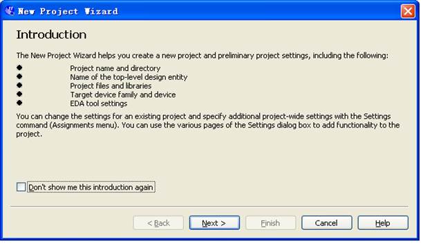 1)選擇開始>程序>Altera>QuartusII10.0SP1> QuartusII10.0SP1,運行QUARTUSII軟件。或者雙擊桌面上的QUARTUSII的圖標運行QUARTUSII軟件,出現如圖1-3所示,如果是第一次打開QUARTUSII軟件可能會有其它的提示信息,使用者可以根據自己的實際情況進行設定后進入圖1-1所示界面。