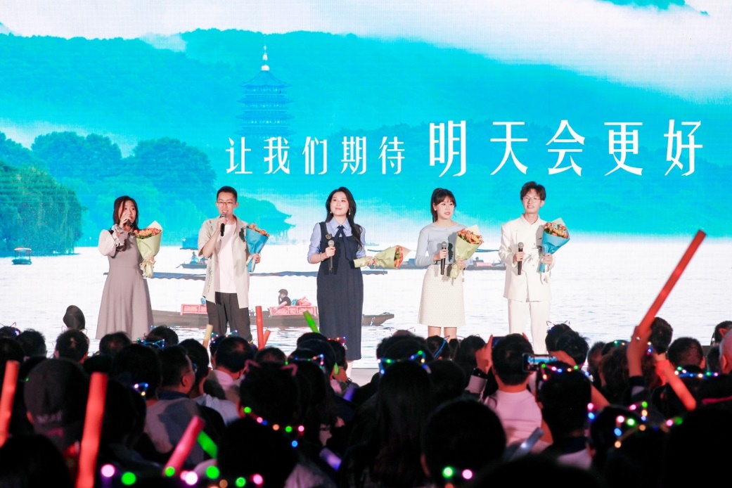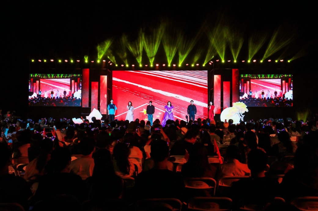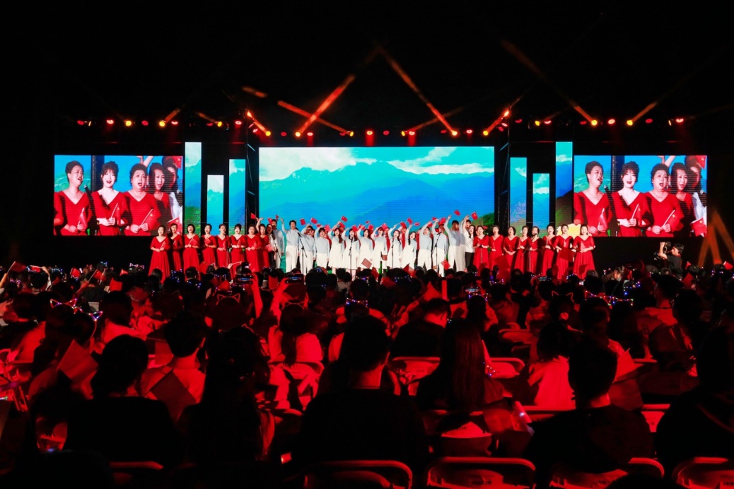 十佳歌手聯袂獻唱的《我愛你中國》向祖國送出最深情的告白,用歌聲獻禮祖國華誕。大屏幕上一幅幅中國壯麗風光、建設成就和人民幸福生活的影像徐徐展開,與歌聲交織成一曲動人的視聽交響。 “我愛你中國,心愛的母親”唱響時,全場觀眾深受感染,情不自禁地起身揮動手中的國旗,一同加入合唱。霎時間,草坪化為一片涌動的紅色海洋,激昂的歌聲與澎湃的激情交織,將晚會現場化作一堂生動而深刻的愛國主義課堂。