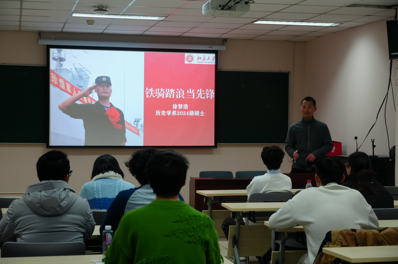 為深化學習效果,學院特別邀請北京大學退役大學生士兵宣講團成員、歷史學系2024級碩士生徐夢浩作專題分享。徐夢浩以“個人融入集體、夢想融入責任、青春融入山河”為主線,生動講述了自己在軍營中錘煉意志、成長蛻變的經歷,分享了在集體協作與奉獻服務中強化責任擔當的深切感悟。他樸實真誠的講述,讓支部黨員深刻感受到軍人作風與偉大抗戰精神在新時代的延續與傳承。