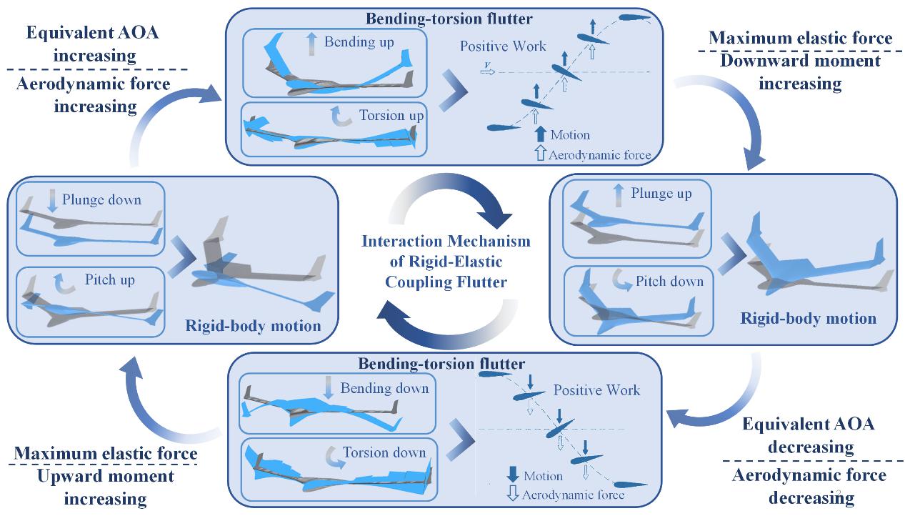 團隊提出僅含四個自由度的剛-彈耦合動力學模型,探明了剛-彈耦合顫振中飛行力學的短周期模態、沉浮模態與結構彎曲模態、扭轉模態間的耦合效應,揭示了敏感參數對剛-彈耦合顫振特性的影響規律。