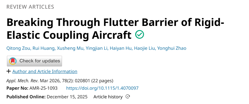 近日,由胡海巖院士、黃銳教授領導的團隊在飛翼布局飛行器的剛-彈耦合顫振抑制技術研究方面取得突破。飛行試驗表明,該團隊成功實現結構強度極限內的剛-彈耦合顫振屏障突破,將安全飛行速度提高62.5%,創造了該領域的世界記錄。相關研究成果以“Breaking Through Flutter Barrier of Rigid-Elastic Coupling Aircraft”為題發表于力學領域頂刊《ASME Applied Mechanics Reviews》(影響因子:16.1)。論文第一作者為我校航空學院博士生鄒奇彤,通訊作者為南京航空航天大學黃銳教授和北京理工大學胡海巖院士,航空航天結構力學及控制全國重點實驗室為論文第一完成單位。該研究工作獲得國家自然科學基金委員會優秀青年科學基金、國家自然科學基金青年基金A類項目資助,是近20年來我國動力學與控制領域學者在該期刊發表的唯一論文。