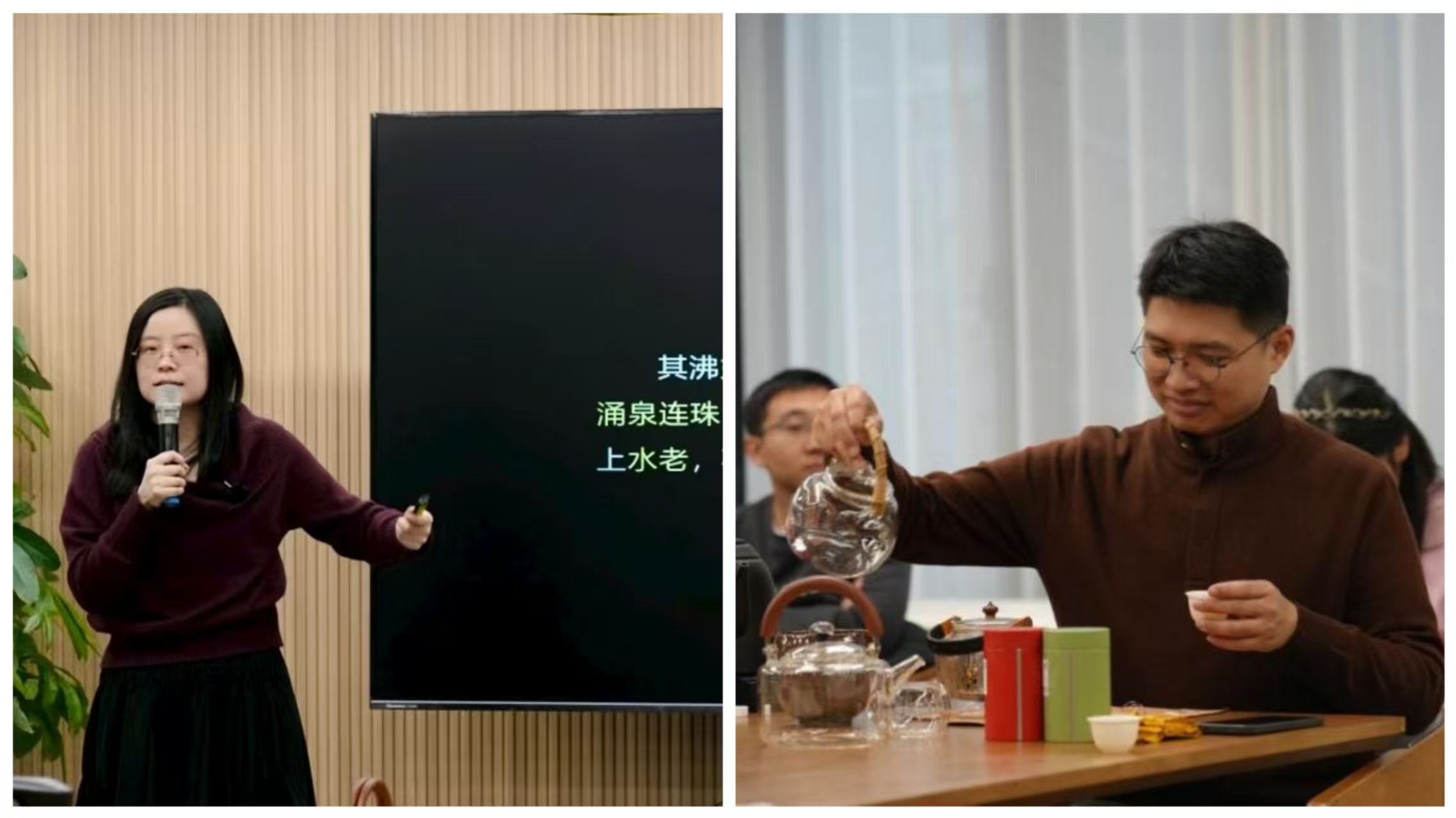 徐千懿以“湯者,茶之司命”為引,圍繞“水如何成就一泡好茶”核心主題,從茶科技史與文化史視角,系統梳理燒水、煎水與用水觀念的千年演變。講授期間,陳重穆同步開展泡茶實踐演示,通過繞注、降溫、控沸等操作,將文獻中的“湯法”轉化為可感知、可理解的現場體驗,使抽象的歷史概念與當代飲茶實踐形成直觀對應。