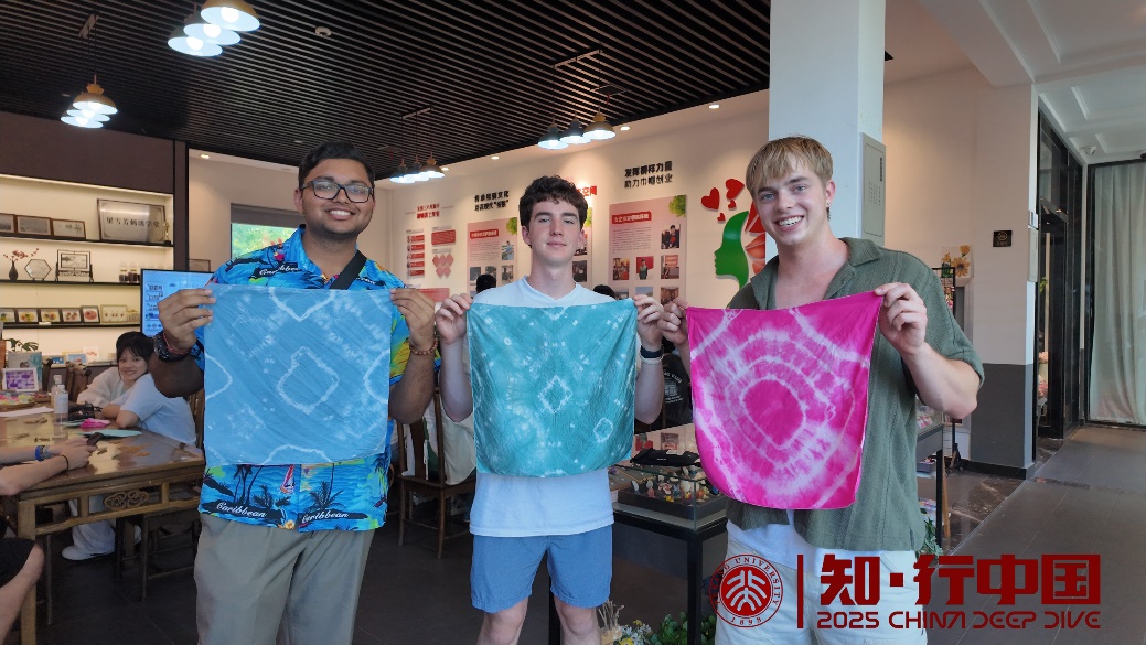 在平江路歷史文化街區,青石板路被雨水打濕,倒映著兩旁的紅燈籠。美國學子與蘇州大學志愿者并肩而行,聽評彈藝人彈唱《楓橋夜泊》,看手藝人制作糖畫。“我喜歡藝術,在蘇州博物館,我看到建筑、歷史與藝術的交融,”喬治城大學的Hanna在蘇州博物館體驗了扎染藝術后意猶未盡,“我還買了一幅小畫”。