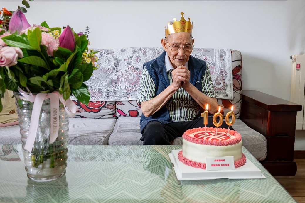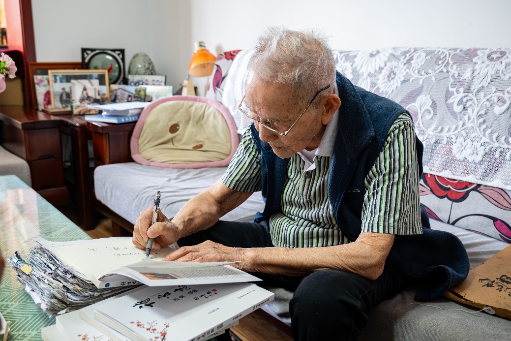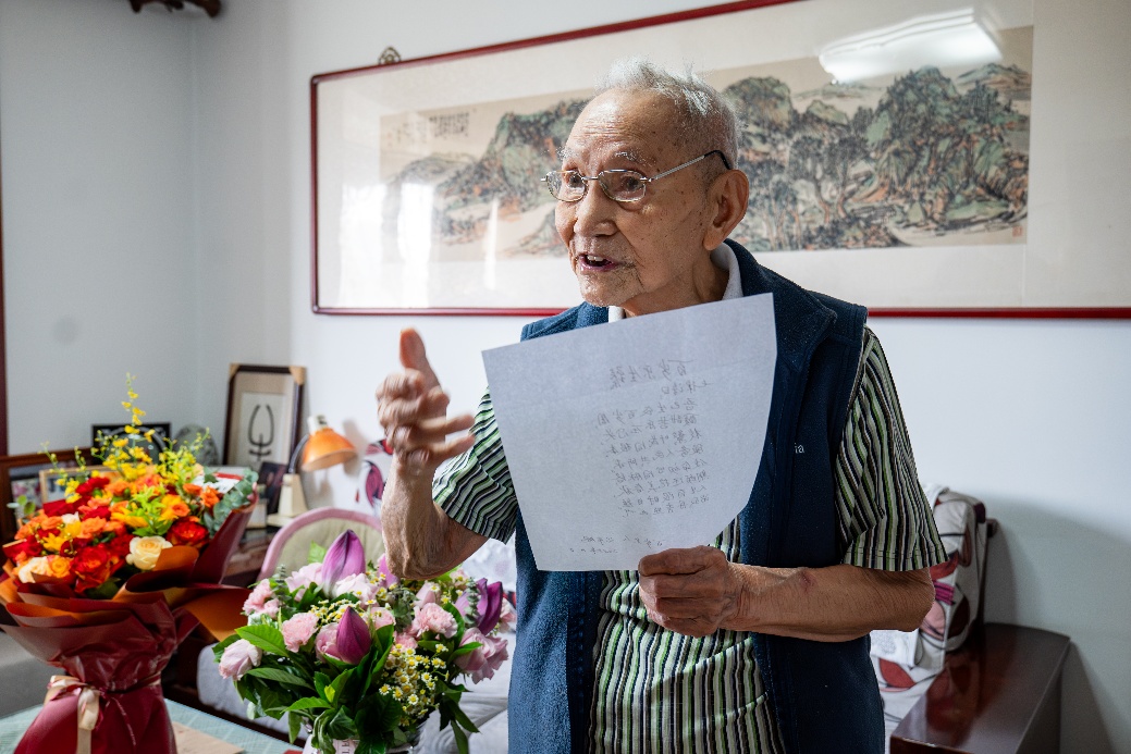 這位精神矍鑠的期頤老人,至今仍堅持獨居自理。每當吟誦起自己創作的詩篇,讀至情動處,他那洪亮的聲音總能讓人不自覺感染熱忱的力量。